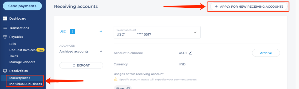 To apply for a new receiving account, simply click on the "Marketplaces" tab and select "Apply for new receiving accounts" on the top right. From there, select the currency you would like to receive payments in and choose the platform(s) you will be receiving payments from. After submitting your application, you will receive a prompt indicating that your application was successful.