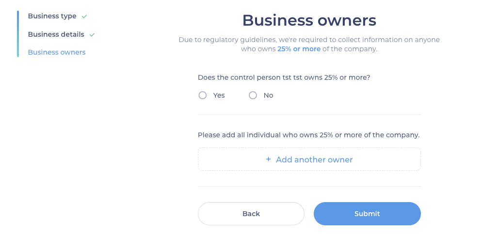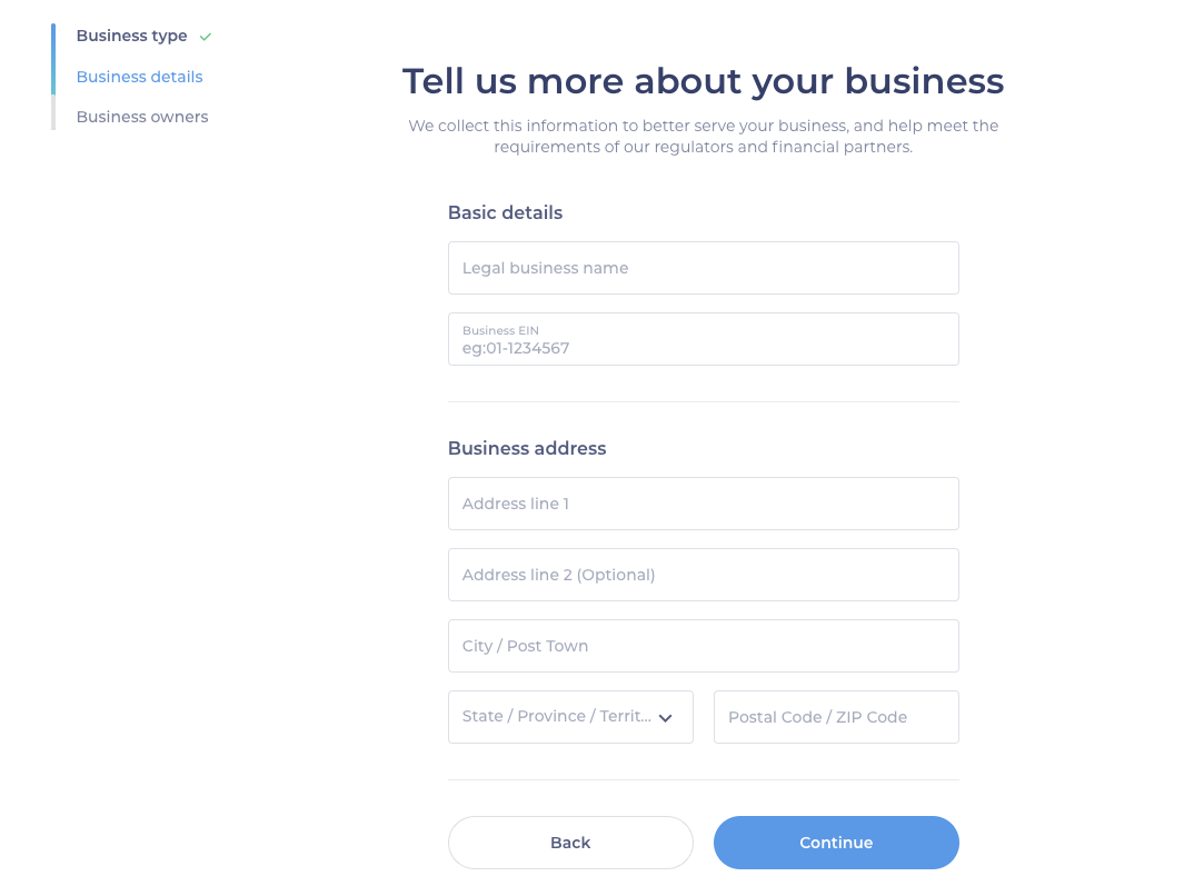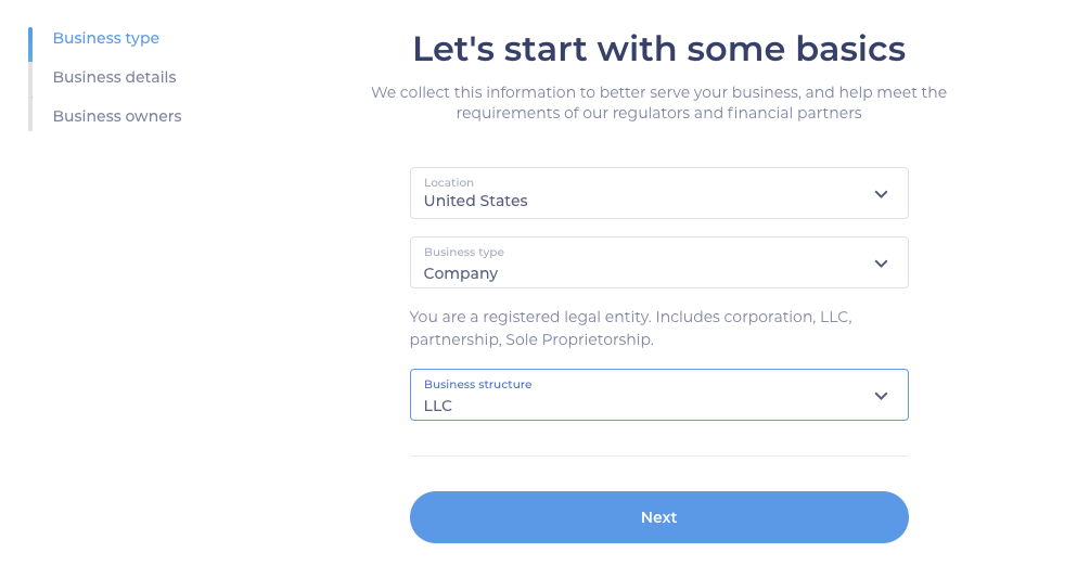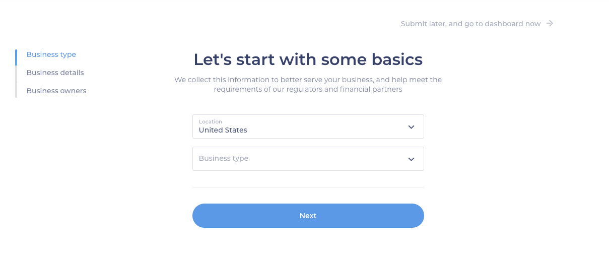 Step 7: Choose the location and account type (Business or Sole Proprietorship), and confirm the information. Fill in your other business details.