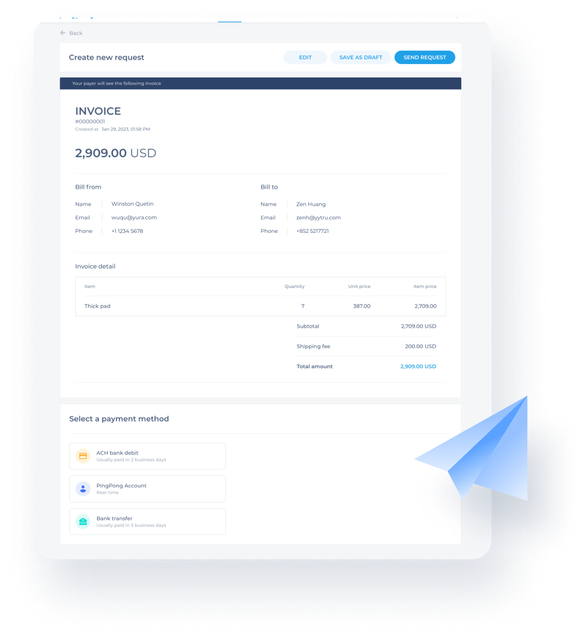 Send invoices and receive payments securely and transparently worldwide. Create, send, and track invoices within minutes, with real-time payment status updates and same-day payments.